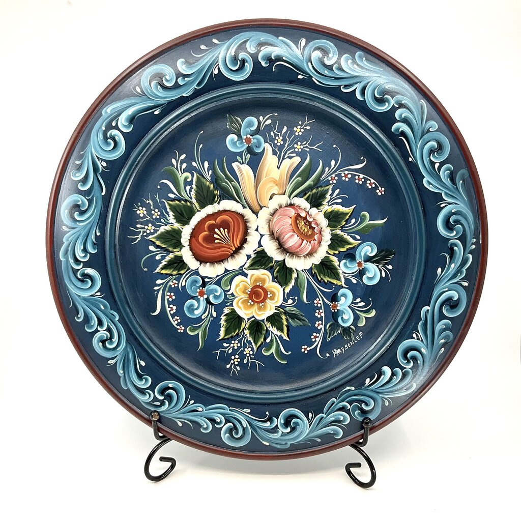 A wonderful example of beautifully hand-painted Rosemaling to hang in your home! Spectacular 14" painted plate in the Valdres Style of Rosemaling is carefully painted by our wonderful instructor Mary Schliep. Rosemaling means "rose painting" in Norwegian. Rosemaling is a decorative painting style that originated in Norway where it traditionally decorated churches, homes, and farmhouse interiors. The Valdres style of rosemaling originated in the Valdres valley and is known for its strong floral motif. This particular plate is primarily blue with a gorgeous edging in lighter blue and white scrolling and a brick red outer rim. The center is painted in the traditional Valdres style with shades of green, red, tan, white and again the lighter blue. The plate is ready to hang on your wall for a classic touch of authentic Scandinavian culture. The plate is 14" in diameter.