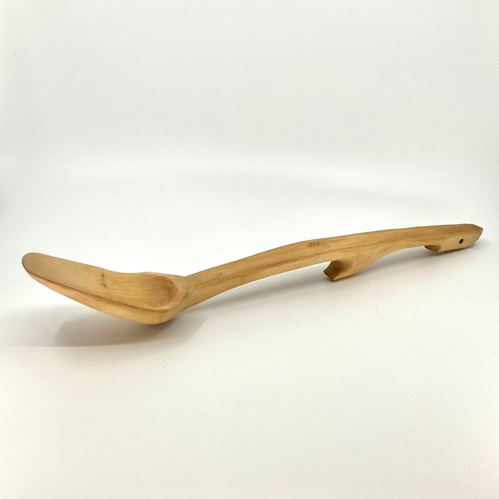 Hand-carved by our North House instructor, Jon Strom, this handsome birch spoon is 16.5" long and 2.5" wide has graceful lines and a perfectly notched handle to hang on the edge of your pot. The spoon has a light oil finish. Hand wash and treat regularly with a food-friendly oil such as tung oil, don't let it soak in water, and keep it out of direct heat to preserve this handcrafted item for a lifetime.