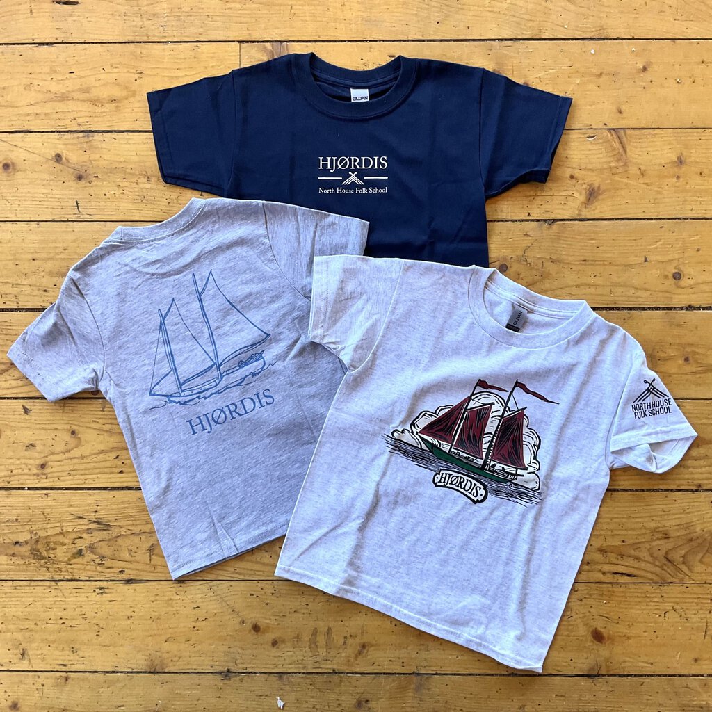 GRAY: Hjordis name and North House timber logo silkscreened on the front and simple sailboat image silkscreened on the back. In Gray with sky silkscreen on lighter weight 90% cotton, 10% polyester.