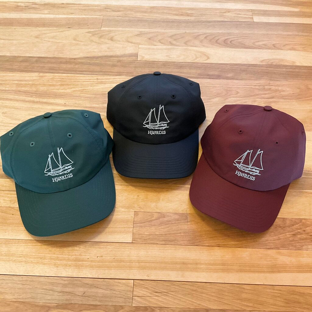 Hjordis Polyester Cap, with the Hjordis Logo embroidered on front in light gray. "North House Folk School" is embroidered on the back above the velcro-adjustment strap. The cap is made by RICHARDSON and is 100% polyester, designed to repel water.