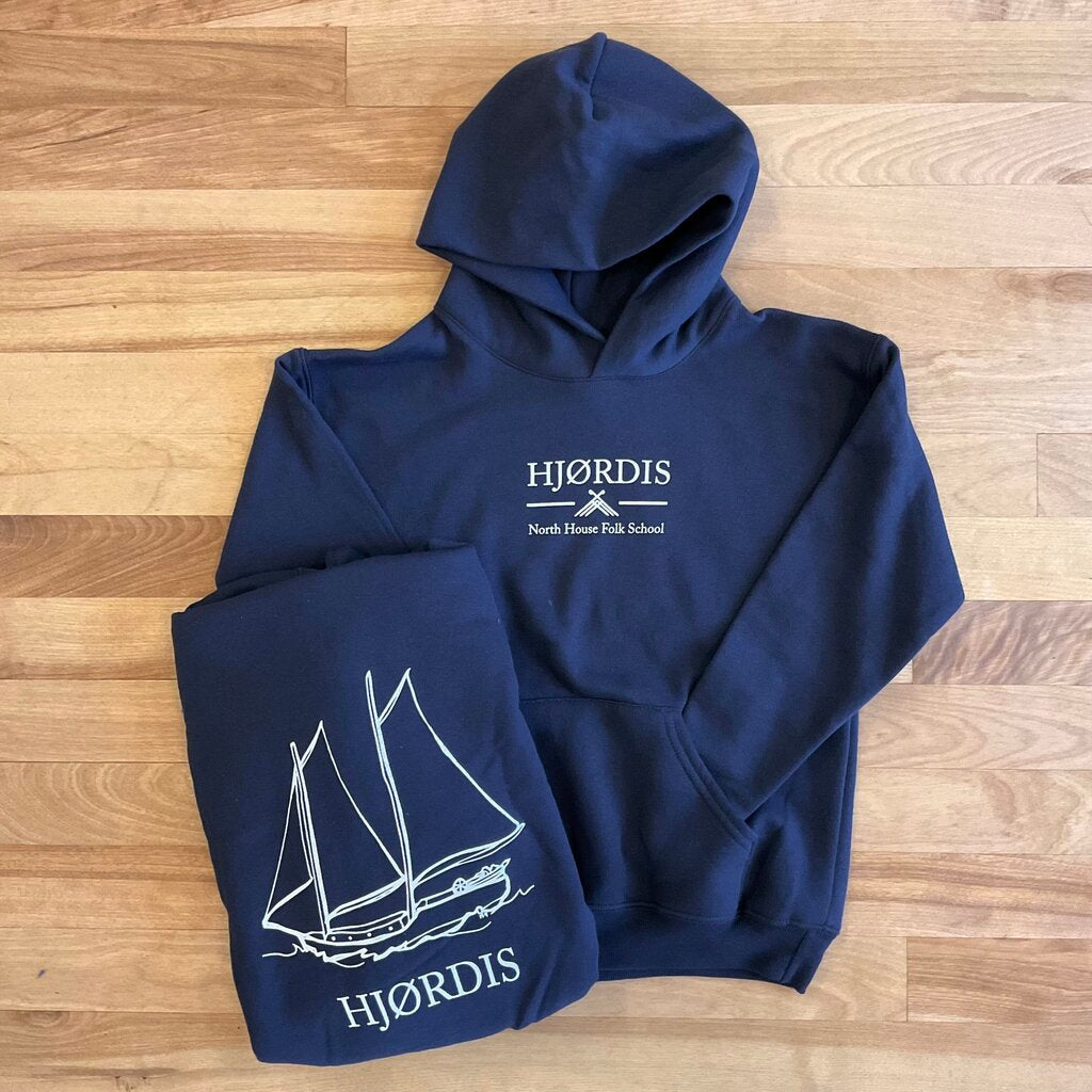 Keep your kiddos cozy with the kid-size kid-themed Hjordis Hoodie in navy. White silkscreen on 50% cotton, 50% poly blend.
